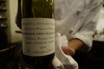 ここでシェフが選んでくださった白ワインをいただくことに!この白ワインがこれまたおいしい〜!コート・シャロネーズ・ブラン“レ・クルー・エメ”2012年というそうです。今まで飲んだことがない風味と味わいでした!