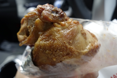 でもローストチキン大好きなので、もちろん買ってみることに〜!手羽とモモと丸焼きがあるようですね。丸焼きはちょっと大きすぎるので、モモにしようかな〜〜〜、、、、売り切れでした。人気が一番だそうです。ということで、手羽のLをいただくことに〜!ショーケースにあった熱々のローストチキンを袋にいれてくださいました。