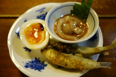 この日はさんまを目当てに伺いました!生ビールをお願いして、まずは先付けから〜!イカの塩辛、お魚のフライ、半熟卵!最高です!