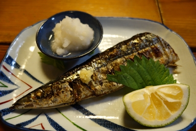 さんまの塩焼きがつづいて登場しました!半身がついてきます。程よい塩加減が最高です!わたも残してくださっているので焼酎によくあいますね〜!