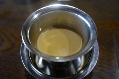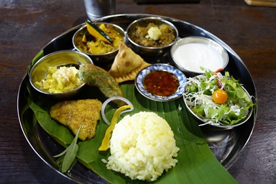 さて、マサラくんとしっかり遊んだあとはお店に入ってお食事をいただきます!今回お願いしたのはランチ、マチュリターリーです。カリー2品、白身魚のスパイス焼き、サモサ、ヨーグルト、ライス、サラダ、そして最後にチャイが登場するんです。