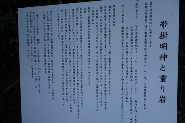 「昔市岐姫命が乳飲み子を背負い、出雲から厳島までを旅する途中、ここで休み、 岩に帯を掛けたことから「帯掛岩」とされ、市岐姫命を祀り帯掛明神としました。