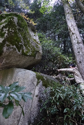 登って行くとこれまたすぐのところに大きな岩が!本当でした!大きな岩が重なっています!そして確かに落ちそうな感じに見えますね!ネットで調べてみると縦横高さ共に約2mの花崗岩2つが1m足らずで接して重なり合っているんだそうです。