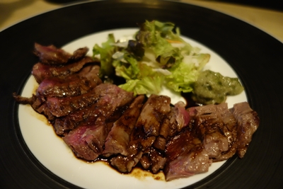 ここでメニューで気になっていた40日間熟成牛ハラミステーキをお願いしました!最近熟成肉が脚光をあびていますが、私はそんなにたべたことがなかったのでかなり楽しみに!登場した牛ハラミはとってもおいしそう!そしてボリュームもしっかり!うれしいですね〜!一口いただいてみると、、、おおおお!おいしい〜!熟成されているからかお肉の柔らかさに品を感じますね。これはうまい!
