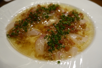 まずは、生ビールをお願いして本日のおすすめの魚のカルパッチョをいただきました。このカルパッチョがものすごくおいしい〜!ヒラメだったと思いますが、もう絶妙な状態にして提供されています。そして酸味のあるソースがとってもおいしい〜!