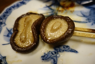 砂肝を塩でいただいて食感を楽しんだ後は、最後の〆!そう、、、、しいたけ!みのわさんのしいたけはほんとうにおいしいですね〜!蒸したような食感になっているんです。しいたけから出汁がじゅわっとしみでてきてこれもまたおいしいです!