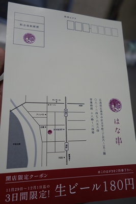 さて、パークサイドホテル広島平和公園前周辺はここ最近新しいお店が続々とオープンしております。そんな中焼鳥屋さんがあったらいいな〜と思っていると、、、先週の土曜日についに焼鳥屋さんがオープンされました!お店の名前ははな串さんです!