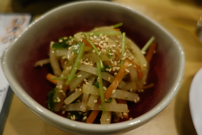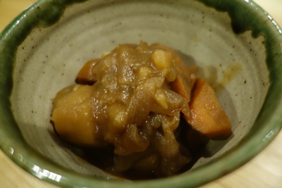 まずは野菜のきんぴらから!ここでいきなり感動が押し寄せました。きんぴらの中にみつばが入っている!これだけで香りもよくなり料理の気品があがりますね!すばらしい〜!