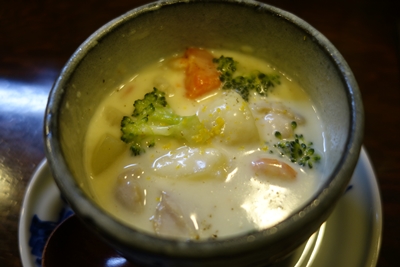 まずは先付けをいただきます!この日はなんとシチュー!思わず、うわ!シチューだ!って大声を張り上げてしまいました。