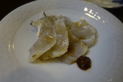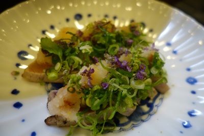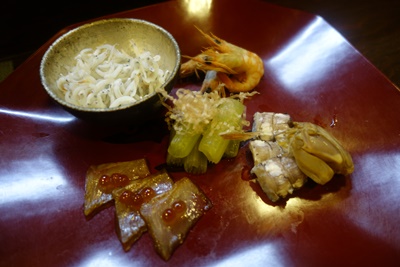 さて、この日もいろんなおいしそうなメニューがありました!何にしようかな〜と思いながら、まずは先付からいただきます!この日も超おいしいです!この日は2名分が一盛りで供されました。これはこれで雰囲気あっていいですね〜!カンパチの漬けがとってもおいしい〜!フキもたまりませんね!