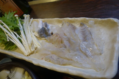 ここでふぐ鍋が登場しました!う〜ん、いい香りがしますね〜!ふぐをしゃぶしゃぶとしていただいてみました!いや〜おいしい〜!ふぐ最高ですね〜!どんどん箸がすすんでいきます!こりゃとってもおいしい〜!