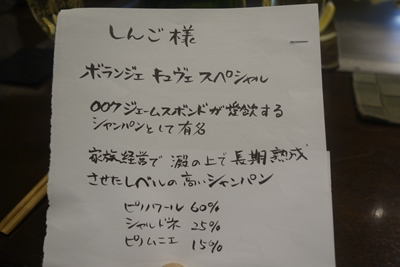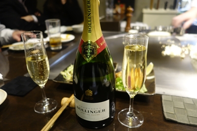 せっかくのクリスマスなのでゴージャスにしてみよう!ということで、最初はシャンパンで乾杯しました!なんと、ボランジェ!くぅ〜、一年がんばってきた自分へのご褒美としてお願いしました!男二人でシャンパンって、、、しんごさんもそう思っていたはず、、笑。