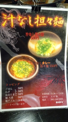 この年末に新幹線に乗る機会が多かったのですが、12月29日に広島駅の新幹線乗り場でなんとあの汁なし担担麺のキング軒さんがお土産用の販売をされているのを目にしました。そのとき何を思ったか、、、それは、、、いますぐにでも汁なし担担麺を食べたい!です。でもそこから今日まで汁なし担担麺を食べることができず、、、、もう汁なし担担麺食べたい欲求を満たさないともう、、、という状態まできていたので、今日行ってきました!