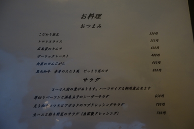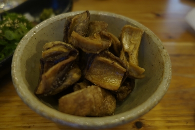 お酒のお供のせんじがらをお願いしました。一応せんじがらって広島名物になっていると思います。ホルモンを揚げて若干乾燥させてあるおつまみです。でも口に含むとじゅーしーでおいしんですよね〜!ぜひ広島名物として食べてみてくださいね!