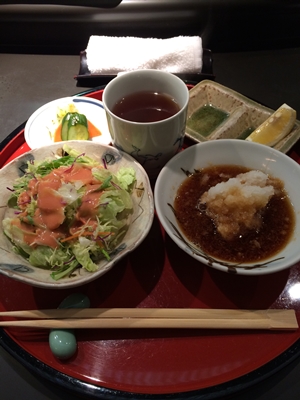 まずは基本セットが登場します。天つゆにたっぷりの大根おろしが入っています。追加もしてくださいますよ〜!こちらにごはんと味噌汁がついてきます!