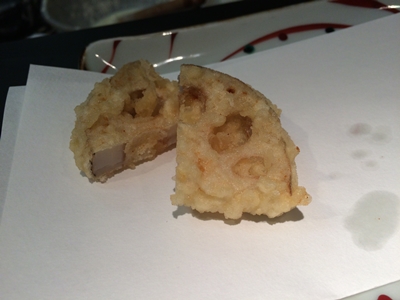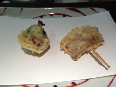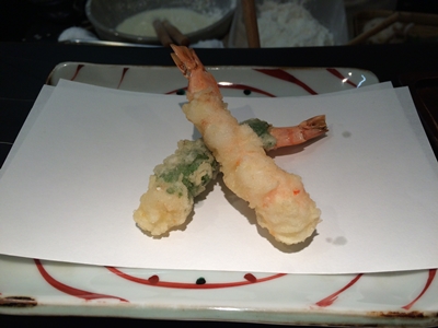 サラダをいただいたらてんぷらが登場します!揚げたてを目の前に提供してくださいます。まずは海老からいただきました!一つはしそ巻きにしてあります。さくっとした食感がたまりませんね〜!おいしい!