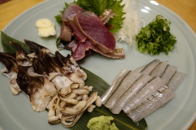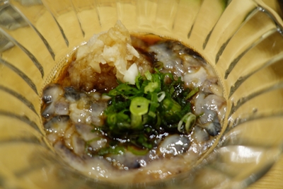 ここでお刺身が登場しました!なんと初ガツオ!おいしいですね〜!にんにくとねぎとオニオンスライスをポン酢でからめていただきました!くぅ〜〜〜、うまい!そして日本酒に合う合う!最高です!
