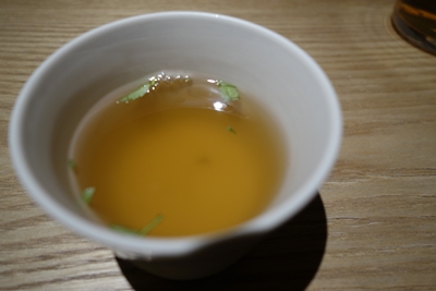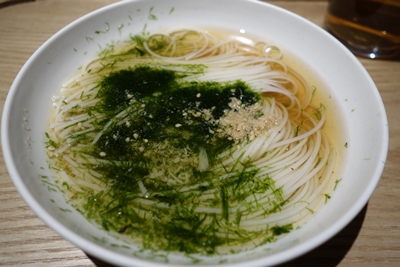 まずは筍のスープから!うん、おいしい〜!つづいて素麺が登場しました。こちらのスープもいいですね〜!青海苔がきいております。