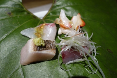 お刺身が登場しました!さわらが特においしかったですね〜!食べ終わって下の葉っぱをどけてみると、、なんとお料理がありました!おもしろい!三原の蛸でした!うまい!!