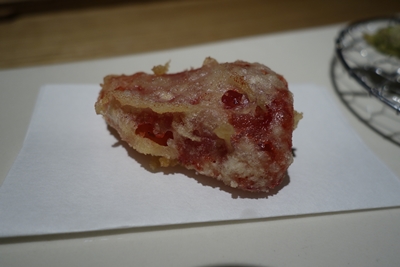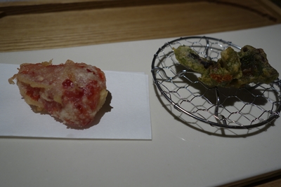 つづいて天ぷらが!ナンだろうと思ったら、、なんといちご!え〜〜!いただくと、、ナイスアイディア!おいしい!煮貝もおいしかった〜〜!