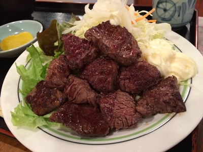 見てください!お肉の量!焼肉と聞いていたので、カルビかなロースかなと思っていたのですが、これ、、ヒレの部分じゃないでしょうか?一つぱくっといただいてみると、、、おいしい〜!これ、、めちゃめちゃおいしい〜!味付けもグーー!お肉の質もグーーー!最高においしい〜!これで1050円?!安いですね!そりゃ人気になるわけですね〜!