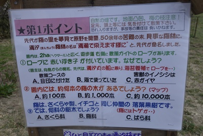 入場料は割引してくださいました。駐車場に車を止めると係りの方が梅園を案内してくださいました。100円を追加するとクイズラリーに参加できるということで参加してみました。農園に入ると、そこにはたくさんの梅の木が!