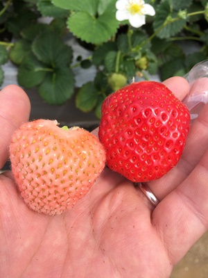 「とうくんは、高級いちごなのでぜひ食べてくださいね!桃の風味を感じられるのが特徴です!色がうすくても食べごろですから〜」