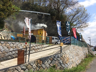 さて、ちょっと前のお話になりますが安芸灘大橋を通って上蒲刈島に訪れた際に車を走らせているとこれまたとっても美しい桜の木が!きれいだな〜と思っているとその先に煙がもくもくでているところが、、、何やらお店のようですね、、、なんだろうと思って近づいてみると、、、うどんの原と書かれていました。うどん屋さんのようです。ちょっと小腹がすいていたので立ち寄ってみることにしました。