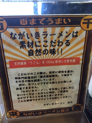 席について待っている間に店内の案内を拝見しました。ながいきラーメンとは、、、なんと麺にうこんを練りこんであるんだそうです!なるほど〜!うこんラーメンなわけですね!うこんは体にいいですからね〜!