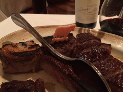 そしてそこに待望のお肉が登場しました!ステーキは、サーロインとフィレを一度に楽しめる看板メニューのプライムステーキをお願いしました!ものすごいボリューム!そして熱い!専用熟成庫で28日間を目安にゆっくりとドライエイジングした「プライムグレード」の牛肉を、なんと900℃のオーブンで焼き上げ熱々の皿に乗せて提供してくださいます!900℃!!!バターがジュウジュウいっていますよ〜!
