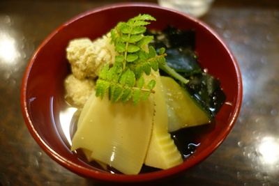 ここで出汁をいただきたいな〜と思いまして、筍と魚の子とわかめの炊き合わせをお願いしました!えび一さんの出汁はほんとおいしいです。体にしみわたりますね〜。魚の子がこれまた筍とあいますね〜。ワカメもいいアクセントになっています。おいしい〜〜〜!