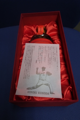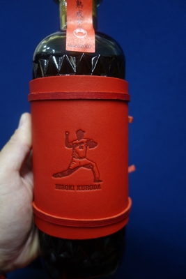 「広島東洋カープ・黒田博樹投手のカープ復帰を祝い、黒田投手がメジャーリーグに挑戦を決意した2007年に樽貯蔵をした本格芋焼酎原酒を使用したお酒です。芋焼酎原酒の甘みに加え、上質のモルトウイスキーを連想させる、ふくよかで円熟した味わいが特徴です。ラベルは、黒田投手愛用のグラブを製造している 株式会社エスエスケイ様のグラブ革を使用し、黒田投手の投球フォームを1つ1つ刻印した特注品です。同じ風合いのものは2つとない、世界で唯一の特別仕様ラベルとなっています。」