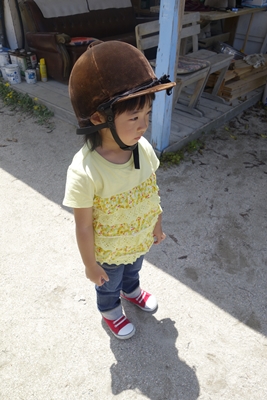 娘は1歳のときから何度かこちらで乗馬させてもらっているのですが、さすがに最初は緊張感が伝わってきますね。帽子をかぶって、いざお馬さんに!
