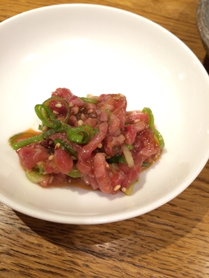 まずは生ビールで乾杯させていただきまして、まずはユッケからいただきました!管理が徹底されている和牛のユッケですからおいしいに決まっている〜〜〜!