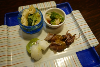 まずは生ビールで乾杯しました!マスターズドリームやはりうまいですね〜!最高です!続いて先付けとして、ほたるいか、イカの白子、鯖の白子、煮浸しが登場しました!鯖の白子!めちゃおいしいですね〜!しめ鯖もお店で作られているからこそいただける逸品!手がかかっています!