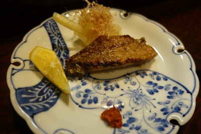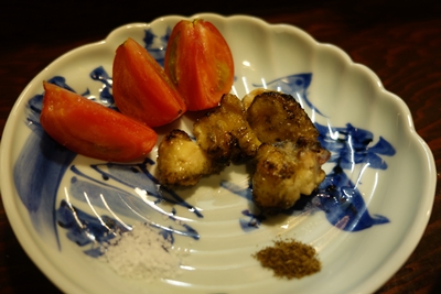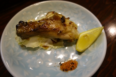 ここで、名古屋コーチンの皮が登場しました!この皮がこれまたおいしいのなんのって!ほんと素晴らしい弾力でした!もうたまりません!山椒をつけていただくと、なおのことおいしいです〜!いや〜すばらしい〜!鶏の皮でなかなかここまで満足できませんよね〜!