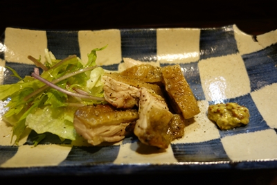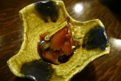 名古屋コーチンをこれでもかというほど味わった後は、マグロの漬けをわさびの茎の部分と一緒にいただきました!器はその陶芸の先生の作品なんです〜!いや〜見た目もいいですね〜!こちらは先日うかがった際に大将にこっそりお願いしていたメニューにない一品でした!最高においしいです〜!
