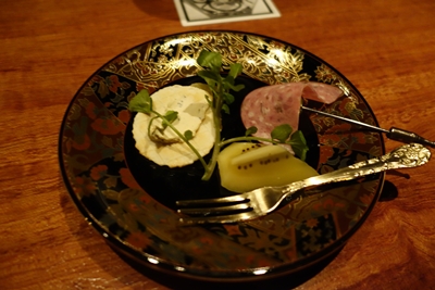 ビールをいただきながら、出していただいたチャームにこれまた感動!どれもとってもおいしい〜〜!ゴールデンキュウイ、オリーブ、ハム、そしてトマトのチーズ!りんごのドライフルーツ!大満足でした!