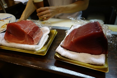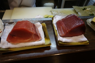 見た目ではっきり違いがわかりますね!やはり脂がのっているほうが本まぐろなのか、、、いや、、、ひっかけ問題かもしれない、、、、まずは食べてから、、、ということでいただいてみると、、、なるほど!見た目と同じく片方は脂がしっかりのっていておいしい!