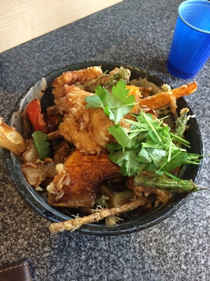 先に同級生のお願いした天丼が登場しました!おいしそう!!!天丼のごはんはおそらく古代米じゃないでしょうか?五穀米かな?赤みがかったごはんがもっちもちでとってもおいしそう!