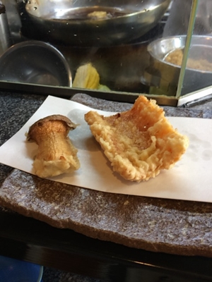 つづいて、とうもろこしとエリンギでしょうか!とうもろこしは、目の前で大将がきれいに包丁で実だけをとって、すぐに揚げてくださいます。甘いですね〜!