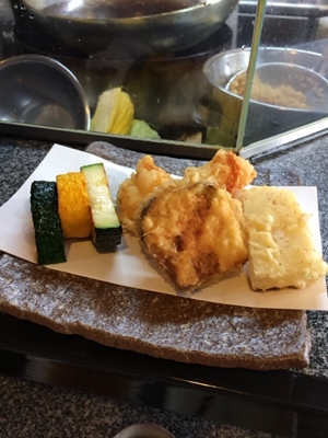ここで、ズッキーニや海老、イカが登場しました!イカは生のイカを揚げてくださいます!中心はまだ生なのかな?ものすごく食感がよくってとてつもなくおいしい〜〜〜!海老もたまらないおいしさです!