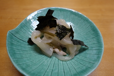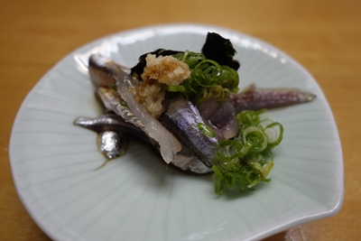 まずは生ビールで乾杯です!こちらはキリンのブラウマイスターがいただけます!うまい!!先付けはイカと小いわしが登場しました!この小いわしがこれまた最高においしんですよね〜!ほんとすばらしい!
