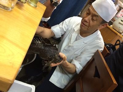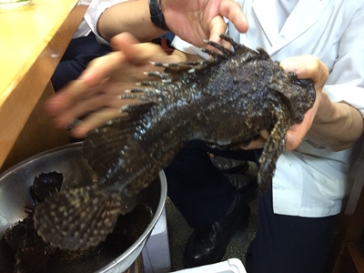 その車海老のとなりにはおこぜくんがいました!大将が素手でおこぜを選んでおられました。おこぜを素手?さすが熟練の技!さすがにおこぜは食べませんでしたが、次回はおこぜをいただきたいと思います。