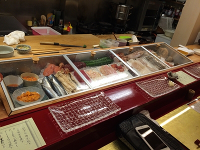 カウンターのショーケースにはおいしそうなお魚がずらりと!本日のおすすめメニューをみてみると、、大羽いわしがあったのでお願いしました!