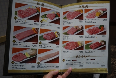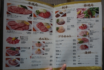 メニューを見てみると、、おおお!すごい!特選から上まで3段階も用意されています!どれもおいしそう!まずは瓶ビールで乾杯しまして、生センマイと上ミノ刺しとチョレギサラダをお願いしました!