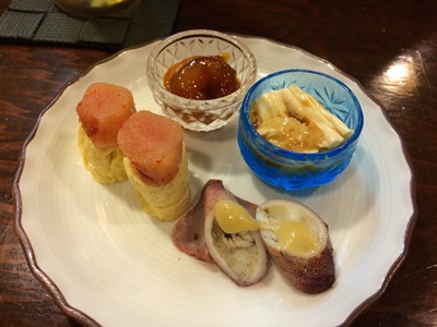 そんなえび一さんではまずは生ビールからいただきまして、いつものおいしい先付をいただきます。毎日伺っているのですが、毎日同じものが出てこないところがすごいな〜。