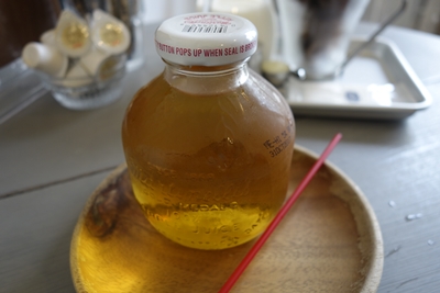 つづいてアップルジュースが登場しました!なんだかみたことない容器に入っています。ふたをあけると、ポンと音がしました。いただいてみると、、、、おおお!おいしい!完全に100%のアップルジュースですね!アメリカから取り寄せていらっしゃるそうですよ〜!