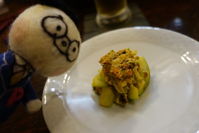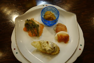 まずは生ビールで乾杯しまして、えび一の大将にパーク君をご紹介しました〜!そして先付をいただきます。スモークサーモンが入っていました。久々にスモークサーモンをいただきましたが、やっぱりおいしいですね〜!