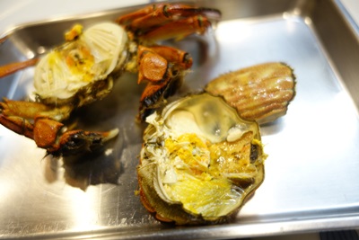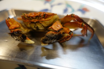 ここで今日の目玉、もくず蟹が登場しました!ウリと合わせていただきます!おいしい〜!最高です〜!